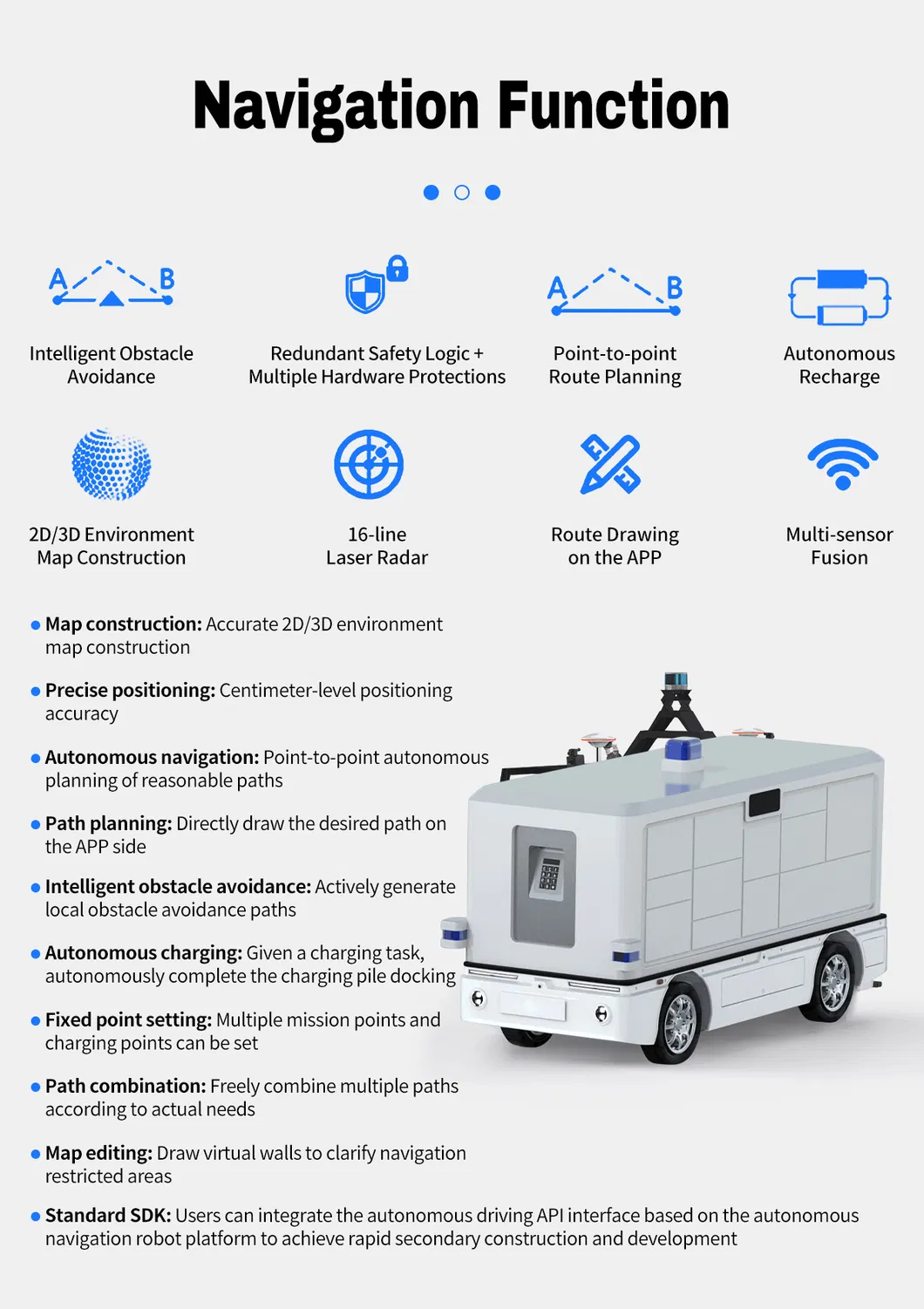 | Applicable Scenarios | Unmanned Delivery, Autonomous Mobile Robot, Logistics, Security, Patrolling |